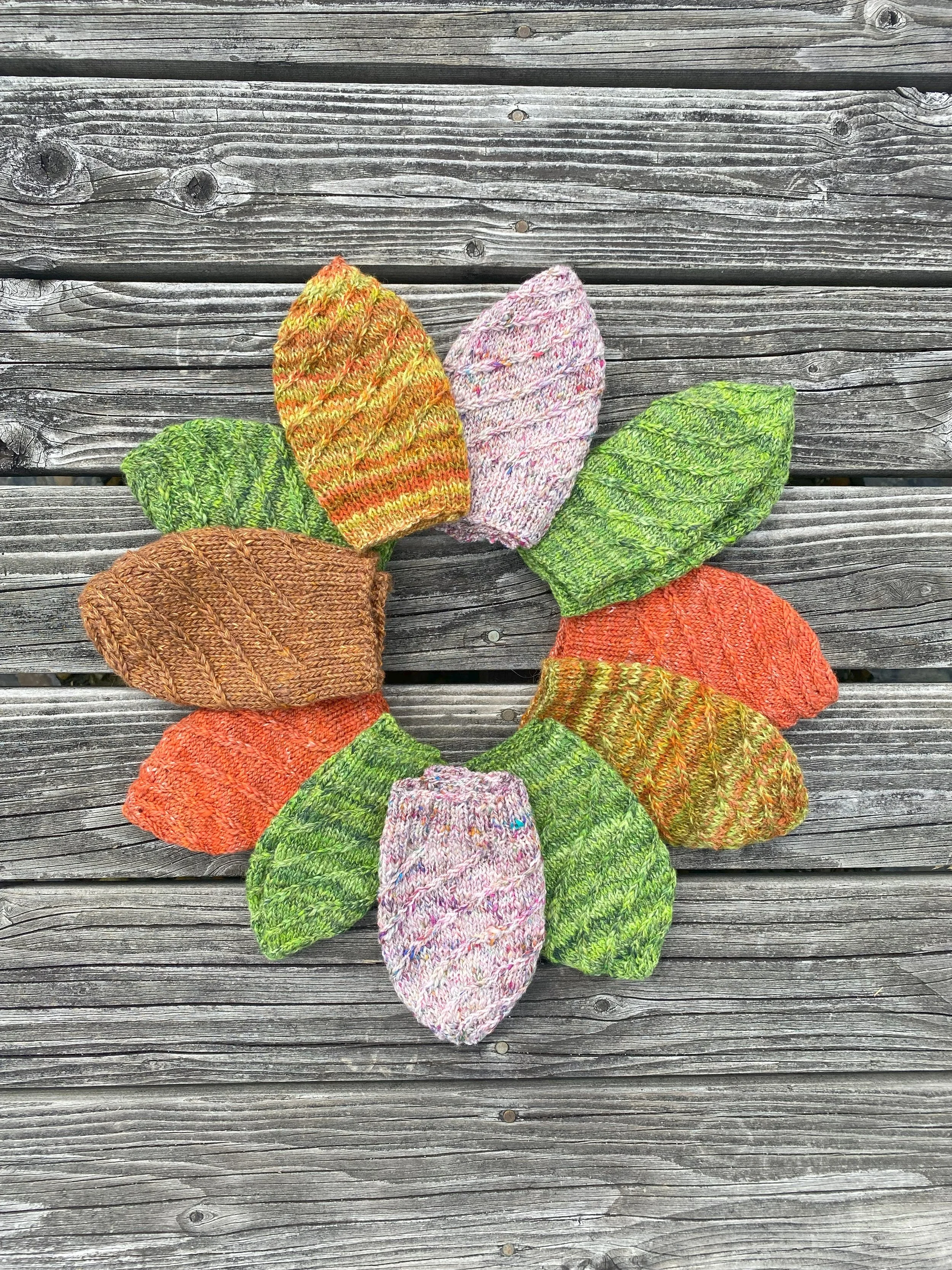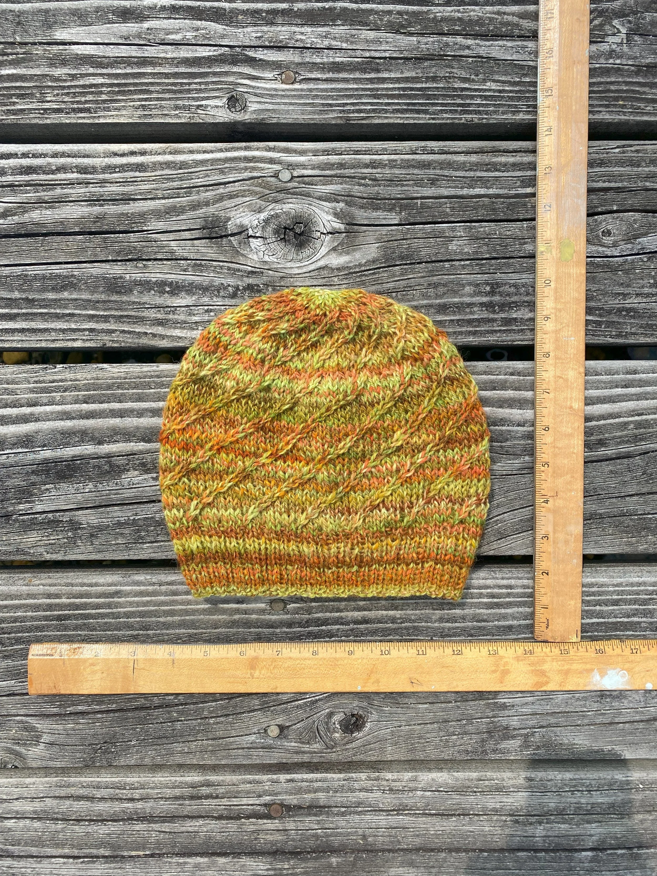 The "Autumn Hues" hat is a dense and luxe hat handspun on a Turkish style spindle out of a merino/silk/cashmere fiber blend curated by "Fellview Fibres" which is a one woman English fiber blending studio. This yarn was spun with love in a tiny Norwegian cabin.